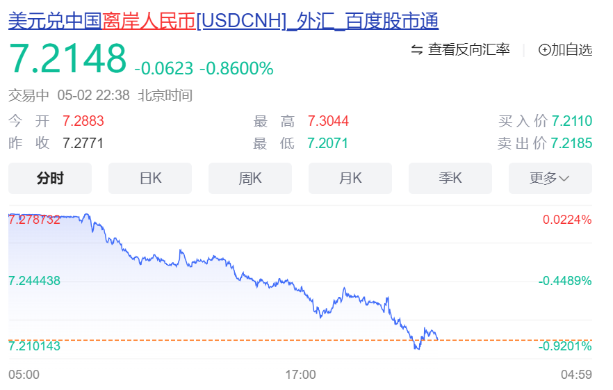 5月2日晚,美国非农数据超预期发布,美股全线拉升。中国资产表现抢眼,热门中概股普遍上涨,人民币日内暴涨超600点,离岸人民币一度升破7.21。