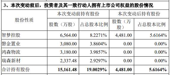 减持后,智梦控股持有公司股份4481万股,占公司总股本的5.6164%。而磐金置业、鸿森物流、瑞森新材已经“清仓”。