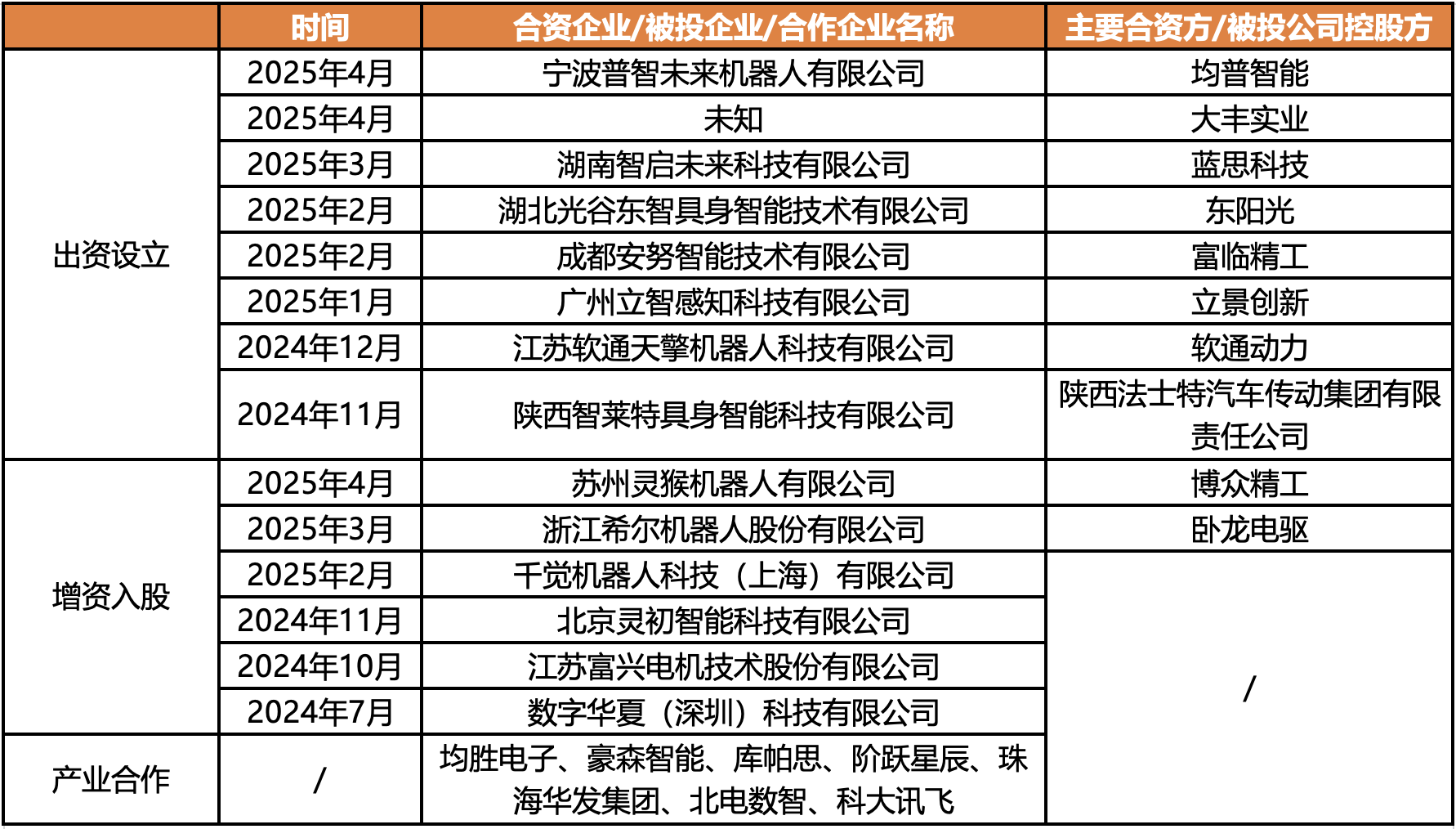 上游聚焦机器人零部件开发,中游着手机器人本体生产销售,下游推动机器人商业化落地。智元的合资方多为上市公司,包括大丰实业、蓝思科技、均普智能等,它们与智元进行能力互补、资源整合。