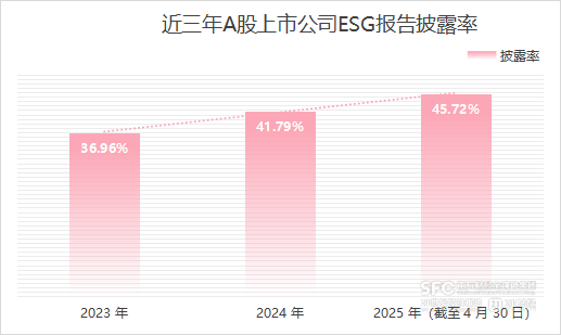 今年A股ESG信披季已圆满落幕。Wind数据显示,A股ESG信披率连续三年稳步攀升,今年更是创历史新高,截至4月30日,信披率已达到45.72%。