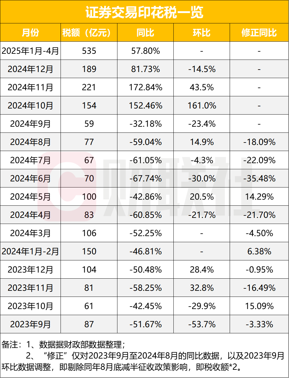 财政部数据显示,2025年前四个月,全国证券交易印花税收入达535亿元,同比增长57.8%,充分展现资本市场交易活跃度回升,投资者信心提振,市场流动性改善,政策效应持续释放。