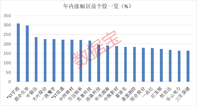 据证券时报·数据宝统计,A股年内涨幅前20名的个股平均涨幅达207.76%。从板块分布看,北交所个股占6只,创业板和主板分别占7只和6只,科创板占1只。