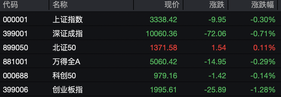 A股市场今天上午整体窄幅震荡,主要指数涨跌互现。截至上午收盘,上证指数微跌0.30%,深证成指下跌0.71%,创业板指数下跌1.28%,而北证50指数则微涨0.11%。
