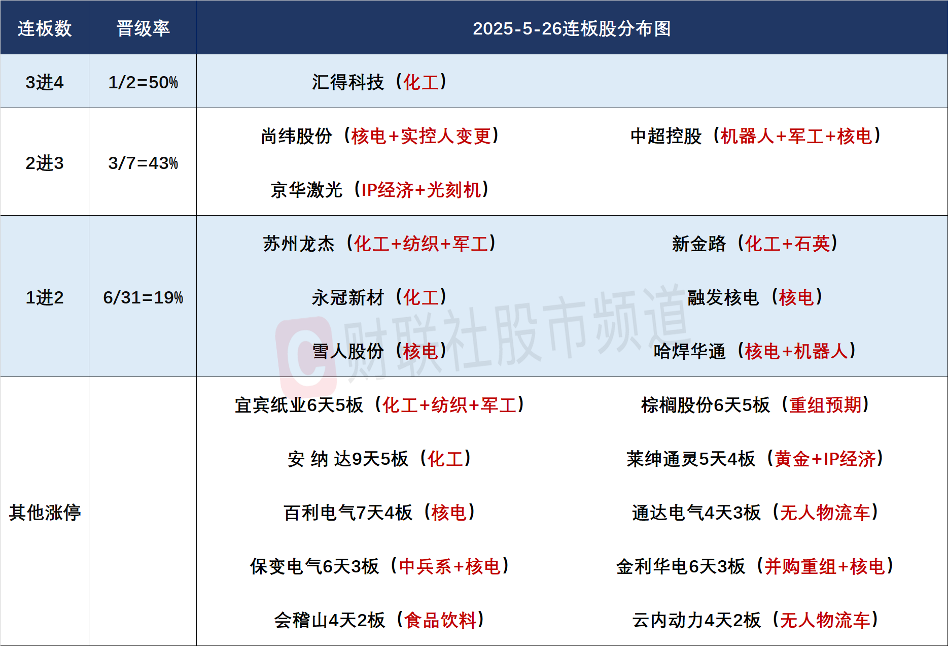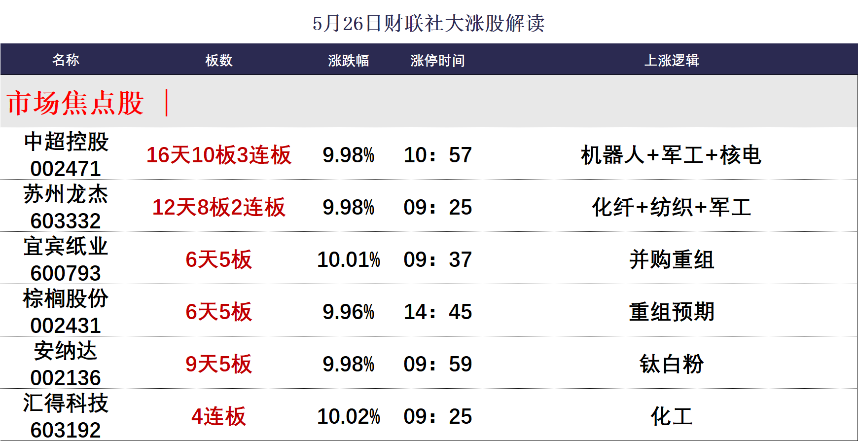 财联社5月26日讯,今日62股涨停,23股炸板,封板率为73%,汇得科技4连板,尚纬股份3连板,中超控股16天10板,苏州龙杰12天8板,宜宾纸业、棕榈股份6天5板,安纳达9天5板,莱绅通灵、京华激光5天4板,百利电气7天4板,通达电气4天3板,金利华电、保变电气6天3板,北交所瑞奇智造30CM首板。沪深两市全天成交额1.01万亿,较上个交易日缩量1456亿。盘面上,个股涨多跌少,全市场超3700只个股上涨,但市场热点较为杂乱。板块方面,可控核聚变、智能物流等板块涨幅居前,创新药、汽车整车等板块跌幅居前。截至收盘,沪指微跌0.05%,深成指跌0.41%,创业板指跌0.8%。