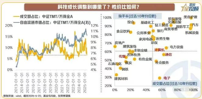 历史上科技成长的“调整-上涨”期显示,大周期阶段性调整平均持续2.9个月,跌幅17%。目前本轮回调已持续3个月,跌幅18%,与历史水平相当。同时,科技成长的止跌回升需情绪上行配合,如产业催化、政策支持、流动性改善。