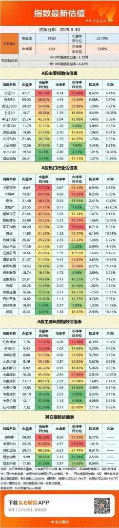 截至5月30日收盘,东方财富Choice数据显示,东财全A市盈率为14.82倍,市盈率百分位为22.7%;市净率为1.53倍,市净率百分位仅为5.08%,市场估值处于相对低位。