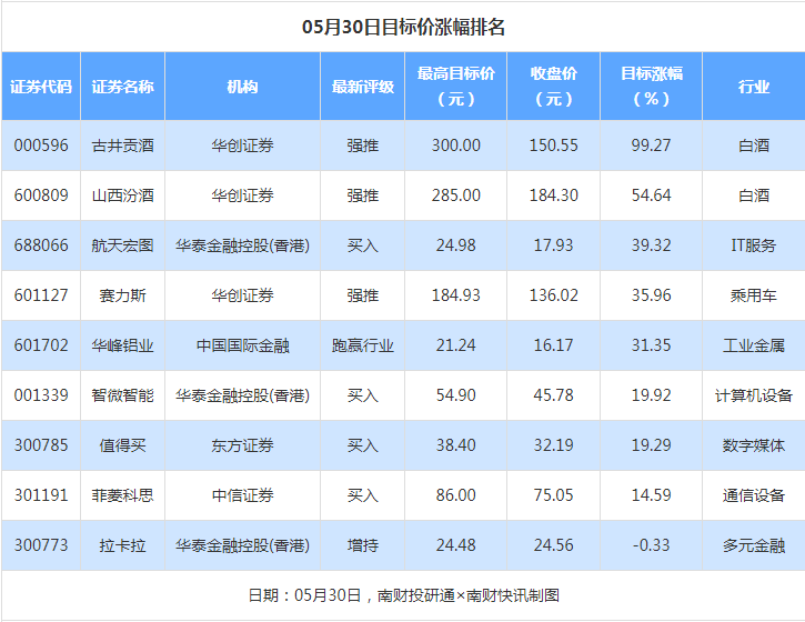 券商5月30日目标价涨幅排名出炉,白酒行业受关注