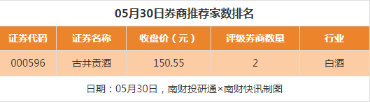 从券商推荐的角度来看,5月30日共有30家上市公司获得券商推荐,其中古井贡酒获得2家券商的青睐,天舟文化和中集车辆也各获得1家券商的推荐。