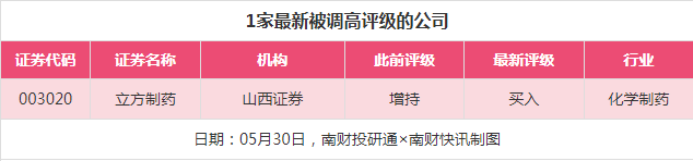 在首次覆盖方面,5月30日券商共给出了11次首次覆盖评级,其中天舟文化获得华鑫证券的“买入”评级,中集车辆获得山西证券的“增持”评级,多家公司如中煤能源、豪江智能和三友医疗也分别获得不同券商的“买入”评级。