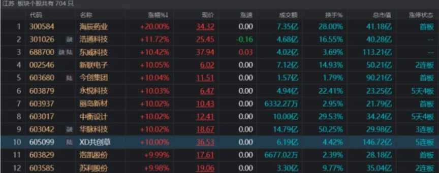 截至6月6日收盘,共有12只江苏地区股票涨停,占比近两成。其中,共创草坪成功晋级5连板,华脉科技获3连板,新联电子、苏利股份等多股也录得2连板。金陵体育股价更是连续三个交易日“20CM”涨停,热度飙升至同花顺A股热股榜第一。