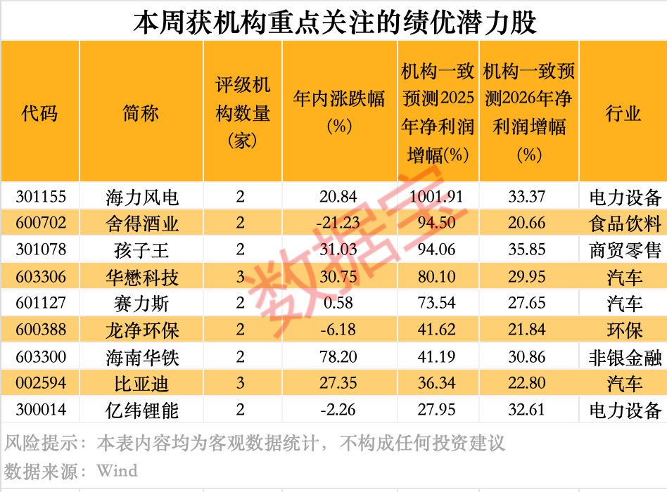 本周获机构“买入型”评级的个股,业绩成长性优质。23只重点关注个股中,9只个股2025年、2026年净利润增幅有望持续超20%,主要分布在汽车、电力设备等行业。海力风电扭亏为盈,机构预测其2025年净利润增幅有望超10倍。孩子王亦获机构看好,净利润增幅有望超90%。