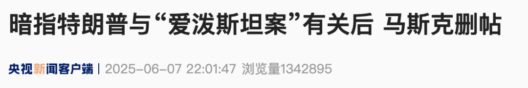 据央视新闻6月7日晚最新消息,马斯克近日在与美国总统特朗普激烈公开争执期间,在社交媒体上发布了一则帖文,暗示特朗普与“爱泼斯坦案”有关联。如今,这条帖文已被马斯克删除。