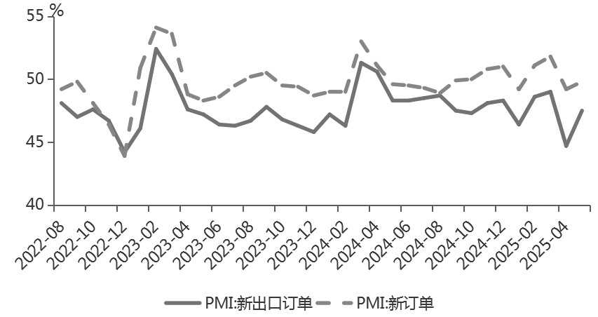 在关税政策调整后,出口逐步回暖,预计二季度经济将继续保持修复态势。从PMI数据来看,出口回暖带动5月制造业PMI上升0.5个百分点至49.5%。大型企业PMI重回临界点以上,中型企业持续下滑,小型企业略有改善。具体来看,产需两端均呈现回暖趋势。5月生产指数为50.7%,较上月上升0.9个百分点,重回临界点以上。新订单指数为49.8%,较上月上升0.6个百分点,新出口订单指数为47.5%,较上月大幅上升2.8个百分点。“抢出口”现象带动外需改善,内需保持平稳。价格指数略有下降。5月主要原材料购进价格指数和出厂价格指数分别为46.9%和44.7%,均较上月下降0.1个百分点,因此5月PPI预计将继续承压。产成品库存持续减少,原材料库存和采购状况有所改善。5月原材料库存指数为47.4%,较上月回升0.4个百分点,产成品库存指数为46.5%,较上月下降0.8个百分点,采购量指数为47.6%,较上月回升1.3个百分点,出口回暖后企业加速原材料备货。非制造业商务活动景气度略有下滑。非制造业商务活动指数为50.3%,比上月下降0.1个百分点,低于季节性水平,但仍处于扩张区间。服务业商务活动指数回升0.1个百分点,至50.2%,主要受“五一”假期提振。建筑业景气度扩张放缓,建筑业商务活动指数下降0.9个百分点,至51%,其中土木工程建筑业商务活动指数为62.3%,已连续两个月景气度回升。