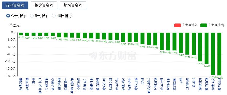 净流出方面,电网设备、化学制药、通信设备等净流出靠前,电网设备净流出17.65亿元。