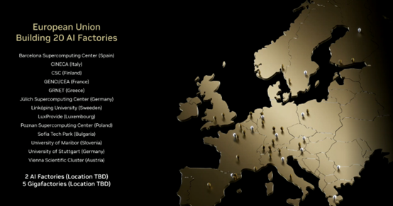 此外,黄仁勋还宣布了英伟达在欧洲的AI基础设施布局计划:英伟达将与当地公司携手,于两年内在欧洲建造20座AI工厂,目标是将欧洲的AI计算能力大幅提升10倍。