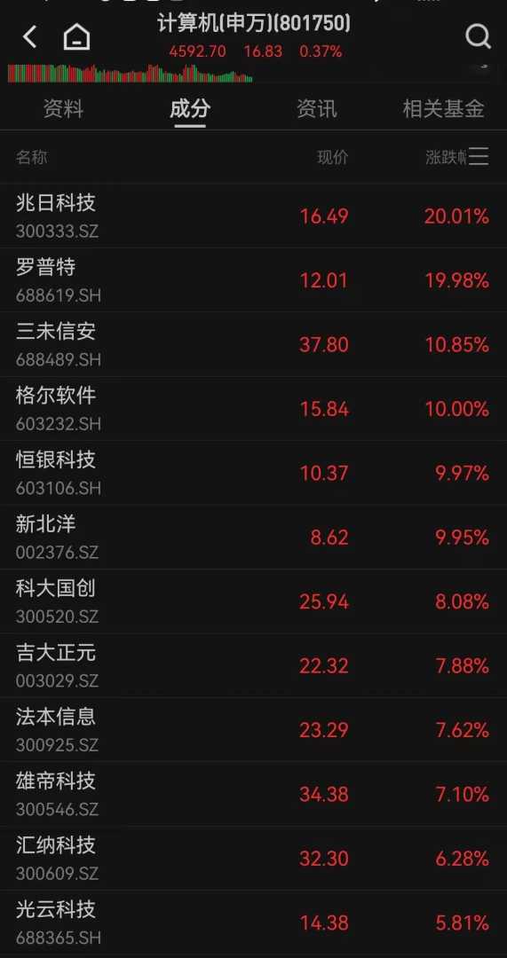 计算机板块表现同样亮眼,兆日科技、罗普特“20cm”涨停,格尔软件、恒银科技、新北洋等个股也纷纷涨停。