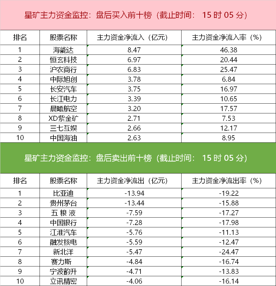 个股方面,海能达资金净流入近8.5亿元,恒玄科技、沪农商行紧随其后。而比亚迪、贵州茅台资金净流出超13亿元,五粮液、中国银行净流出超7亿元。