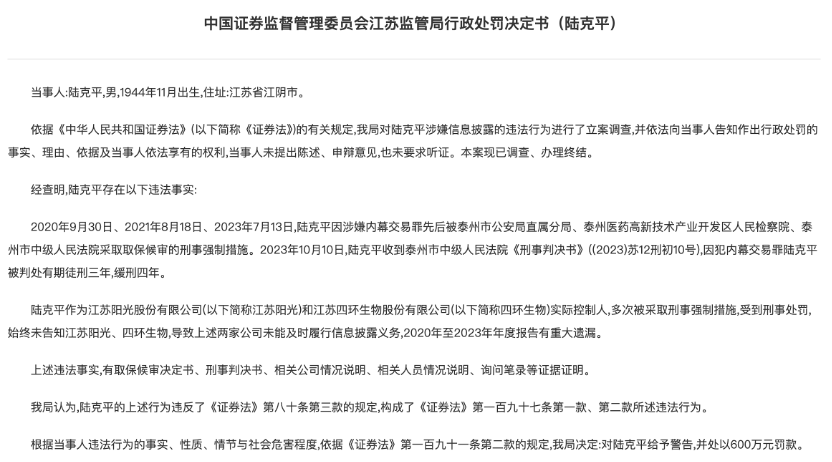行政处罚决定书显示,2020年至2023年间,陆克平因涉嫌内幕交易罪多次被采取刑事强制措施。2023年10月10日,陆克平收到泰州市中院《刑事判决书》,因犯内幕交易罪,被判处有期徒刑三年,缓刑四年。江苏证监局认为,陆克平作为江苏阳光和四环生物的实际控制人,未告知上述两家公司其被采取刑事强制措施的情况,导致两家公司未能及时履行信息披露义务,2020年至2023年年度报告有重大遗漏。基于此,陆克平被处以警告及600万元罚款。