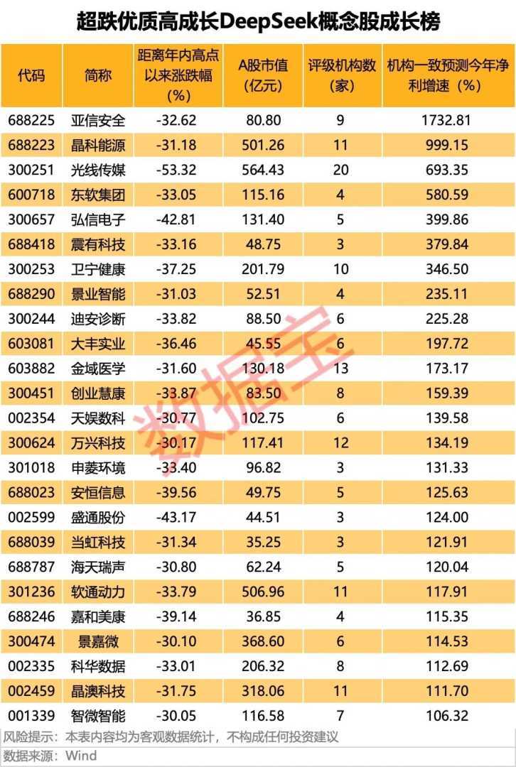 一批超跌高成长概念股引关注。据证券时报·数据宝统计,距年内高点以来跌超30%的DeepSeek概念股中,有25股评级机构数在3家以上且机构一致预测今年净利增速超100%。其中,获得9家机构评级的亚信安全机构一致预测其今年净利增速超过17倍,居首。
