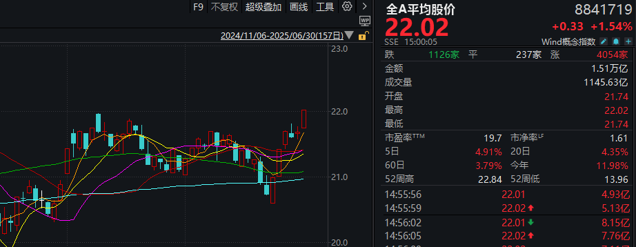 不仅指数在涨,个股也在涨。数据显示,全A平均股价收于22.02元,超过了5月13日的高点(21.97元),有望冲击二季度初的高位。