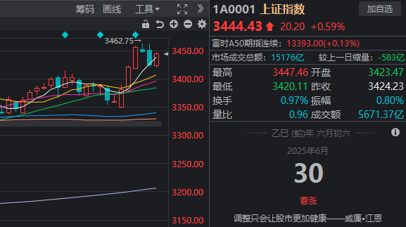 6月30日,三大指数震荡走强。上证指数收涨0.59%,创业板指涨1.35%。