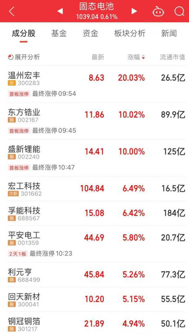 今天上午,固态电池板块反弹。温州宏丰、东方锆业、盛新锂能涨停。