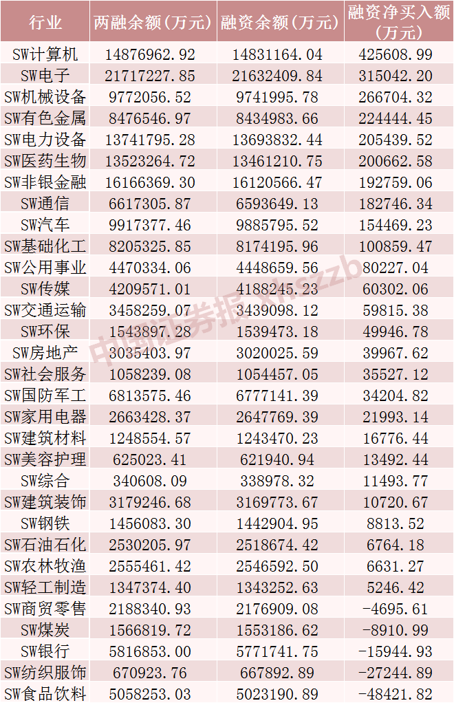从行业情况来看,上周申万一级31个行业中,有26个行业融资余额增加。计算机、电子、机械设备行业融资净买入金额居前,显示出科技和制造业的强劲需求。而在融资余额减少的行业中,食品饮料、纺织服饰、银行业居前。