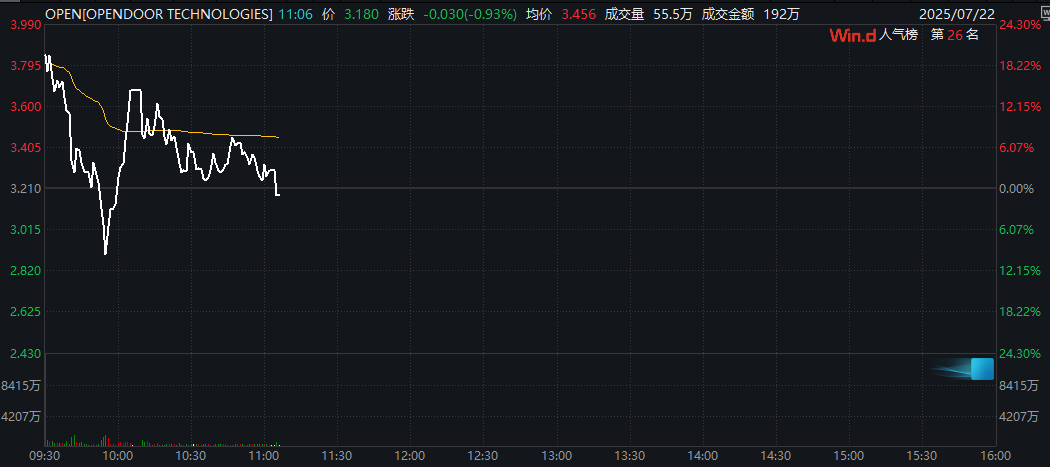 市场数据显示,7月14日至7月21日,OpenDoor股价在短短六个交易日内从不到1美元狂飙至最高4.97美元。7月21日,该股股价盘中一度飙升121%,交易量激增,达到了惊人的19亿股。由于波动剧烈,该股盘中一度被暂停交易。而在22日美股盘前交易时段,OpenDoor股价再度上涨超过20%。美股开盘后,该股股价波动加大,从盘初涨超24%翻绿,一度跌约10%,随后又拉升翻红并触发熔断,截至发稿再度转跌。