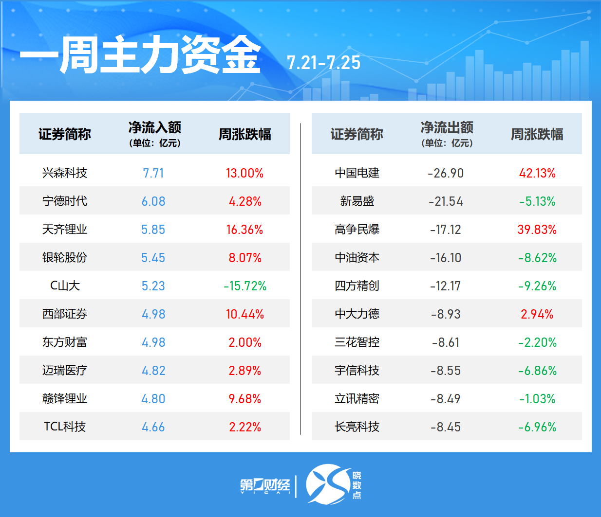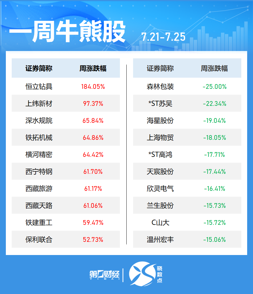 本周(7月21日至7月25日)的五个交易日中,A股三大指数集体上涨,沪指累计涨1.67%,深成指涨2.33%,创业板指涨2.76%。牛熊股:13股周涨超50%,最牛股周涨超180%Wind数据显示,本周共有20只个股涨幅超40%,13只个股涨超50%。北交所恒立钻具涨幅居首,周涨幅达184.05%。上纬新材、深水规院、铁拓机械周涨幅居前。活跃个股:71股累计换手率超100%本周共有71只个股换手率超过100%。其中,南方路机排名居首,周换手率达到229.04%。主力资金:机械设备板块遭抛售近150亿兴森科技获加仓居首按申万一级行业来看,本周五个交易日内,银行、美容护理、综合板块获主力资金净流入,机械设备板块遭抛售近150亿元。杠杆资金:菲利华获融资买入额居首Wind统计显示,本周共有2145只个股获融资净买入,菲利华本周获融资净买入居首。机构调研个股:能科科技获73家机构关注Wind数据显示,机构本周共调研了149家上市公司,其中能科科技最获关注,参与调研的机构达73家。机构本周首次青睐60只个股Wind数据显示,机构本周首次关注60只个股,其中7股被给予目标价。(文章来源:第一财经)