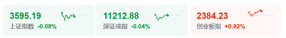 7月29日上午,A股三大股指早盘接近平开后一度走低,随后创业板指持续走强,一度涨逾1%。截至午间收盘,创业板指涨0.92%,上证指数报3595.19点,跌0.08%,深证成指跌0.04%。