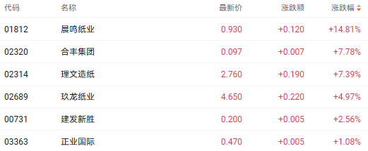 截至收盘,晨鸣纸业(01812.HK)、理文造纸(02314.HK)、玖龙造纸(02689.HK)分别上涨14.81%、7.39%、4.97%。