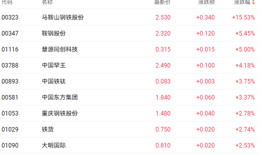 截至收盘,马鞍山钢铁股份(00323.HK)、鞍钢股份(00347.HK)、中国东方集团(00581.HK)分别上涨15.53%、5.45%、3.37%。