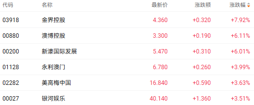 截至收盘,澳博控股(00880.HK)、新濠国际发展(00200.HK)、永利澳门(01128.HK)分别上涨6.11%、6.01%、3.99%。