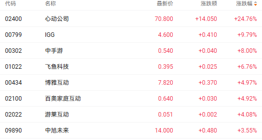 截至收盘,心动公司(02400.HK)、IGG(00799.HK)、飞鱼科技(01022.HK)分别上涨24.76%、9.79%、6.76%。