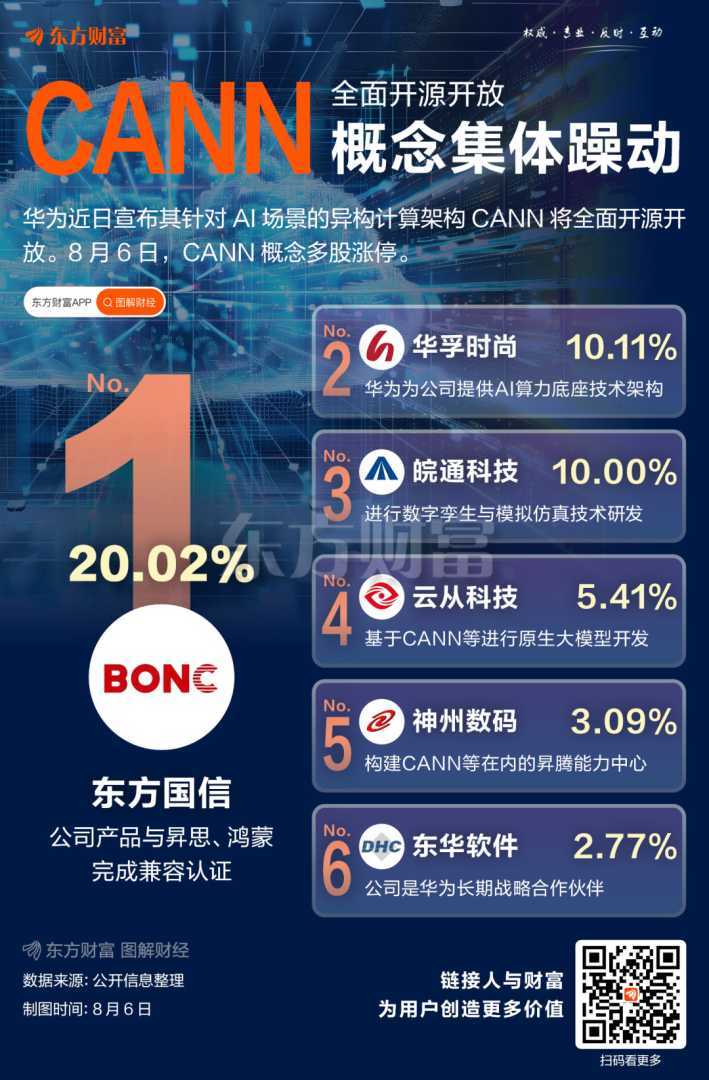 8月6日,CANN概念成为A股焦点,多股涨停。CANN是华为针对AI场景推出的异构计算架构,对提升昇腾AI处理器计算效率至关重要。华为宣布CANN全面开源开放,有助于昇腾生态共建,其AI云服务已为超1300家客户提供算力。