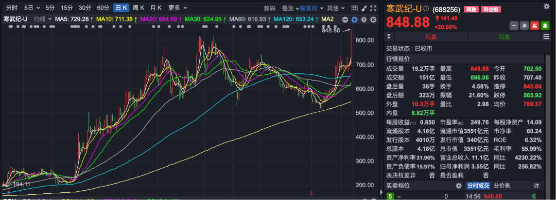 市场热点方面,半导体板块午后放量拉升,板块指数一度涨超3%,创5个多月新高,成交较昨日激增50%以上。龙头股寒武纪—U午后强势20%涨停,历史首次收盘在800元以上,最新市值为3551亿元。上海合晶同样20cm封板,盛科通信、飞凯材料、源杰科技等亦涨停或涨超10%。