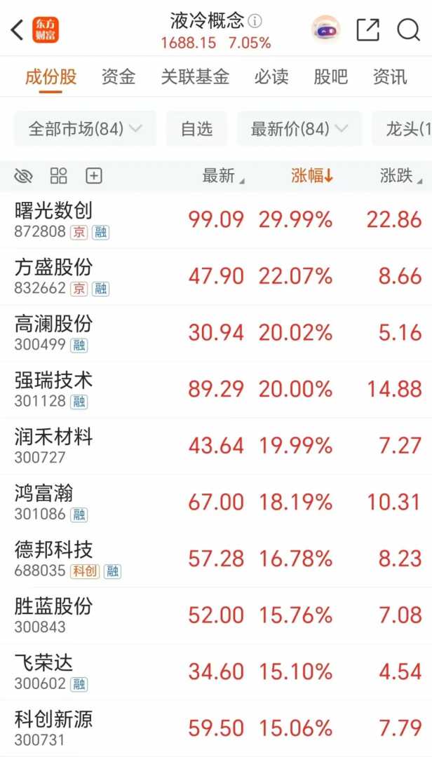 AI算力板块继续沸腾,液冷服务器等多个细分板块涨幅居前,曙光数创触及30CM涨停,创历史新高,高澜股份、强瑞技术、润禾材料等多股20CM涨停。
