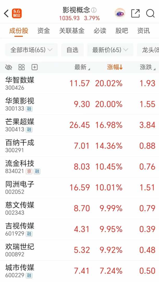 影视概念周一全天表现活跃,板块内龙头股华智数媒、华策影视“20CM”涨停。此外,短剧游戏板块大涨。