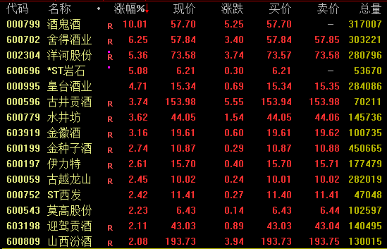 白酒、食品饮料、零售、家电等消费板块盘中集体拉升,截至收盘,白酒股方面,酒鬼酒涨停,舍得酒业涨超6%,洋河股份涨超5%,古井贡酒涨近4%。