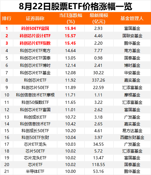 当日股票ETF成交额合计2708.11亿元,与上一日的2090.25亿元相比,成交额激增近618亿元,增幅近30%。其中,科创50ETF当日成交额超百亿元,达到119.86亿元,较前一日翻倍。当日涨幅领先的ETF均集中于科创50指数、科创芯片指数、科创信息指数、科创成长指数以及芯片类指数。其中,科创50ETF富国单日大涨15.94%,领涨ETF市场。科创芯片类ETF全线爆发,国联安、鹏华旗下产品涨超15%,南方、国泰、博时、华安、嘉实、汇添富等公司旗下科创芯片ETF均涨超10%,股市热点不断。