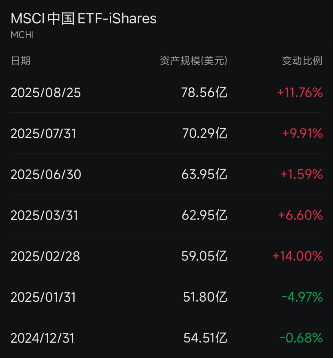 截至8月25日,MSCI中国ETF-iShares资产规模为78.56亿美元,相较于7月底的70.29亿美元增长11.76%;相较于去年年底的54.51亿美元,该基金今年以来规模增长24.05亿美元。