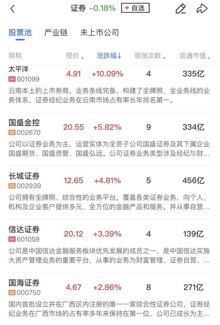 大金融股临近收盘前拉升,太平洋涨停,国盛金控、长城证券、信达证券、国海证券跟涨。