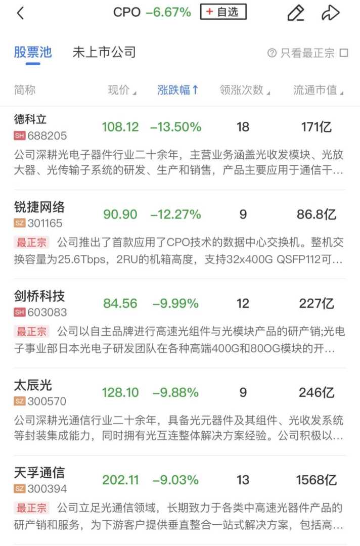 算力硬件股集体调整,剑桥科技跌停,德科立、锐捷网络、致尚科技、华丰科技、太辰光跌幅居前,新易盛、天孚通信同样跌超8%。