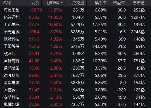 此外,储能、锂电板块拉升走强,海博思创超13%,上能电气、阳光电源、派能科技等跟涨,新能源赛道持续活跃。