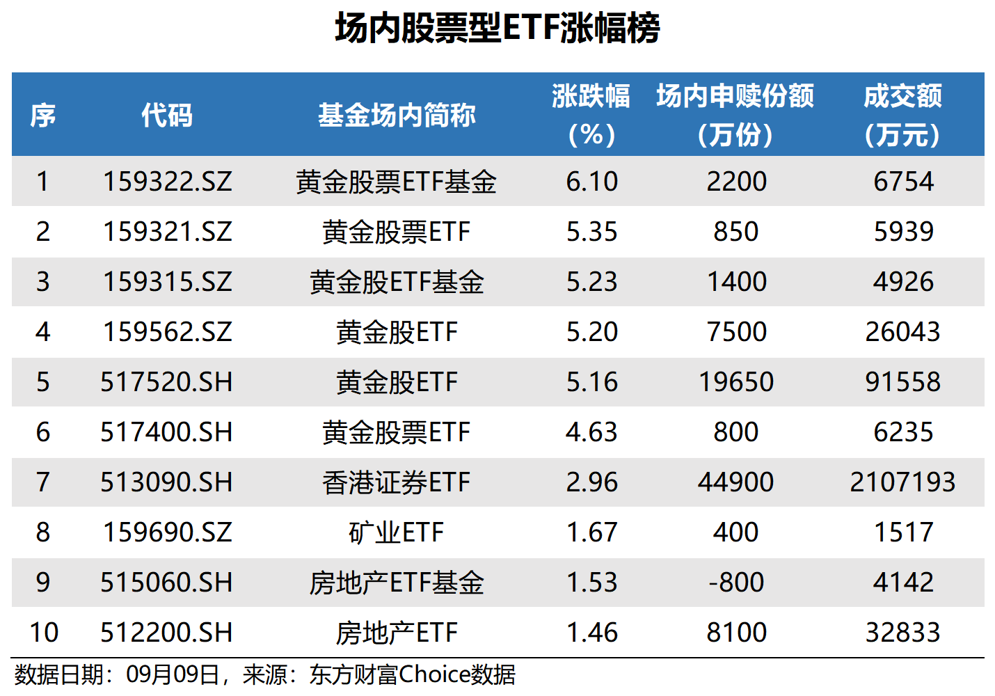 昨日(9月9日),东方财富Choice数据显示,场内股票型ETF净申购39.99亿份;其中,沪市股票型ETF净申购23.02亿份,深市股票型ETF净申购16.97亿份。以最新净值计,昨日市场净赎回7.22亿元。黄金投资成为市场焦点。