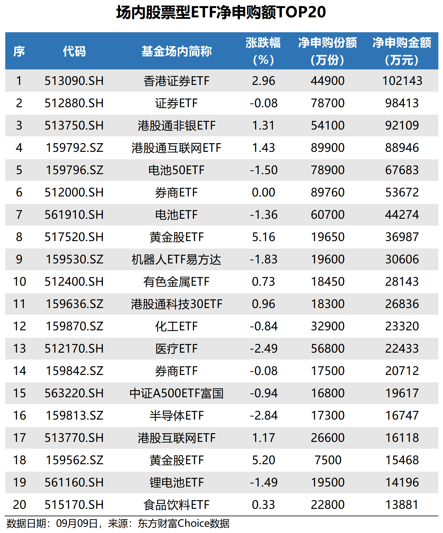 昨日,净申购金额最多的股票型ETF为香港证券ETF,净申购金额为10.21亿元。此外,证券ETF和港股通非银ETF也获购居前,净申购金额依次为9.84亿元和9.21亿元。证券投资持续活跃。