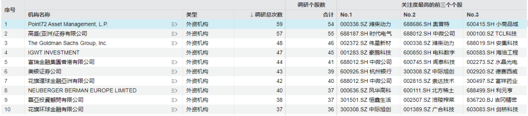 具体来看,Point72下半年以来调研A股上市公司59次,在所有外资机构中排名首位;高盛、美银证券、花旗环球等机构的调研次数也均超过40次。知名对冲基金老虎太平洋基金调研了捷众科技、迈瑞医疗、爱博医疗和鹏鼎控股4家公司。