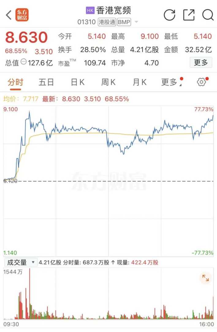 9月18日早盘,香港宽频盘中一度涨超77%,截至收盘,香港宽频涨68.55%,报8.63港元/股,成交额超过32亿港元,总市值超127亿港元。