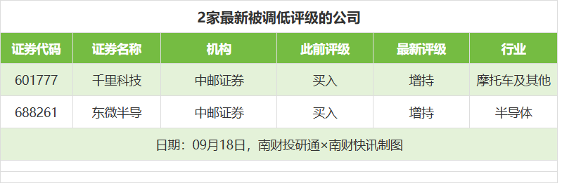 评级调低方面,9月18日,券商调低上市公司评级达到2家次,中邮证券对千里科技、东微半导的评级从“买入”调低至“增持”,这一调整反映了市场对这些公司未来表现的谨慎态度。证券评级调整是市场动态的重要体现。