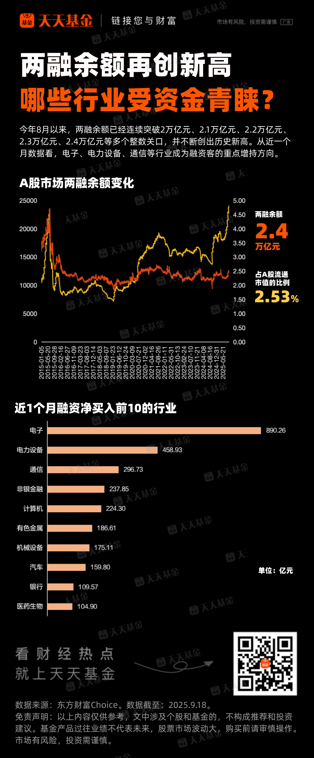 随着A股市场行情的进一步上行,两融余额也水涨船高,再度刷新历史纪录,成为市场风险偏好提升的重要信号。据东方财富Choice数据,截至2025年9月17日,A股两融余额合计值首次突破2.4万亿元,达24054亿元。9月18日,A股两融余额虽然较前一交易日有所减少,但仍然维持在2.4万亿元高位。